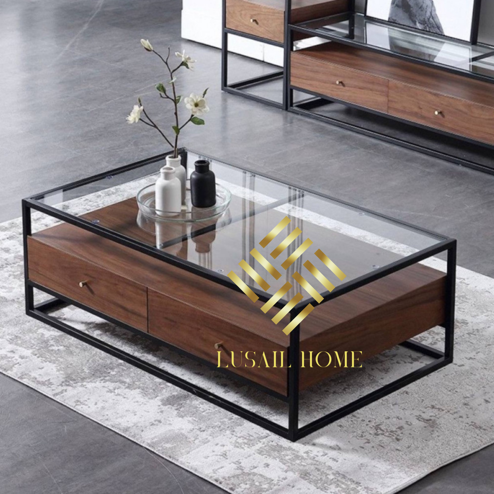 + 25$ Shippingطاولة وسط معدن وجه زجاج بداخلعا طاولة خشبيه ثابته مع جوارير